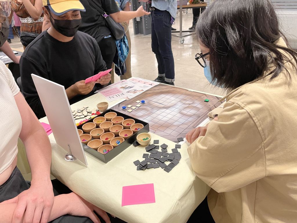 A polymomino-crafting mancala game. Players will create polyomino shapes out of resources they grab within a mancala grid.