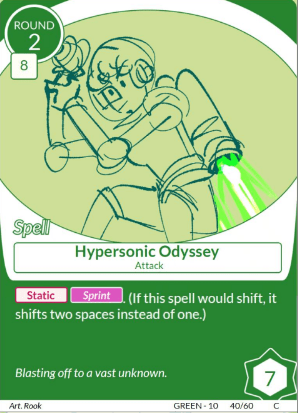 If the red and purple decks are direct translation of TCG concepts, the green deck represents the unique combat design of our game. The green archetype represents these retro-futuristic city where people are crazy about advancing and upgrading, making useless inventions everyday. The shift mechanic represents the flexibility of the spellbook system of our game. Each player has 8 slots in front of them and whenever they fight for a fighter, they will roll numbers of six sided dice and resolve the card on the rolled number’s slot.