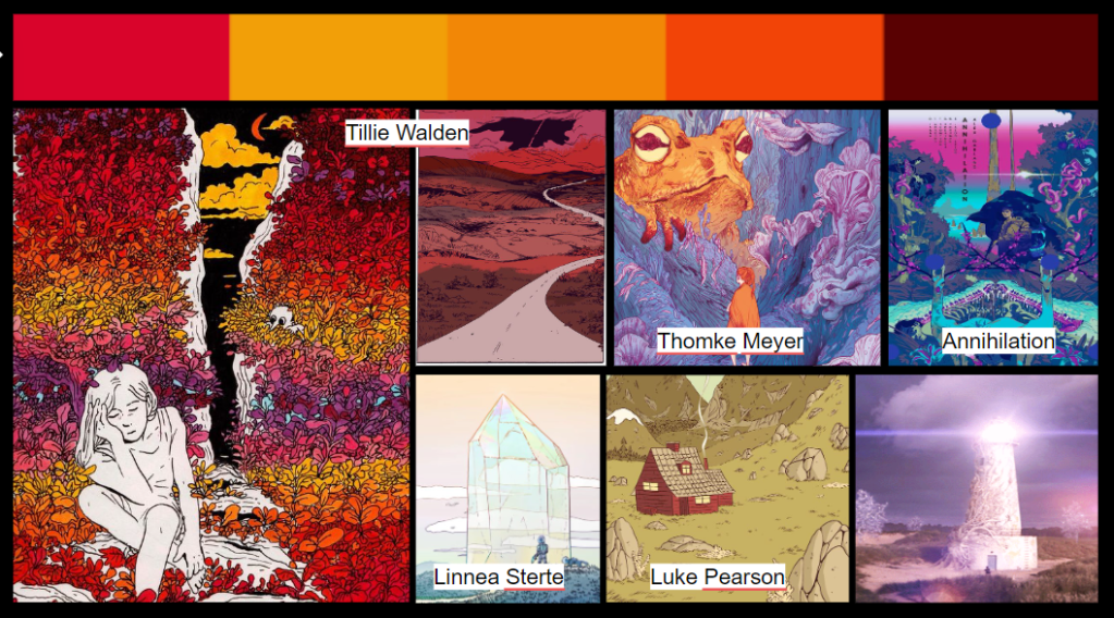 Next, knowing the genre of the story, we decided to create a mood board for the game, which inspired us with this mountain view at dusk. Then, we discovered few art with gigantic crystals sticking out of ground. Combining both the mountain dusk view and dusk, we created this magical realism scene.